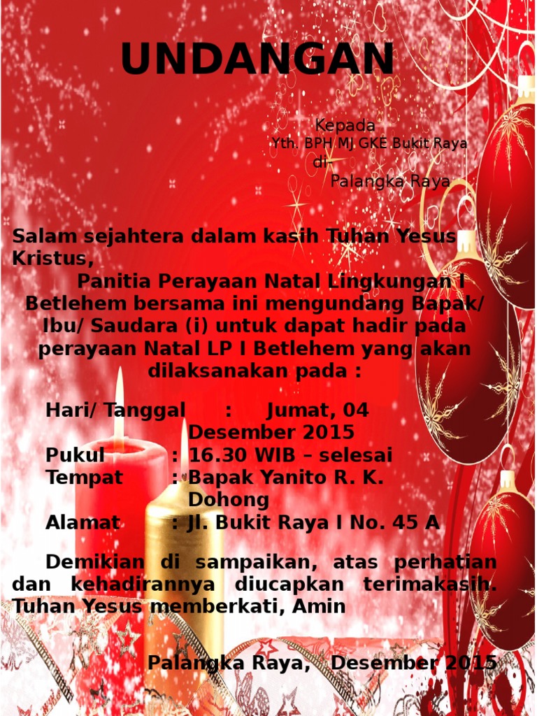Contoh Undangan Natal from imgv2-1-f.scribdassets.com Ketika ingin menyelenggarakan acara perayaan natal, maka tentu dibutuhkan persiapan yang matang. Hormat kami panitia perayaan natal pt. Besar harapan kami kiranya bapak/ibu saudara/i dapat menghadiri perayaan natal yang kami selenggarakan, atas kerjasama dan partisipasinya kami ucapkan banyak terimakasih. Templat undangan yang mudah diakses ini memungkinkan anda membuat undangan pesta hari natal anda sendiri. Sebuah undangan tentunya harus memliki konsep yang matang. By timon adiyoso jumat, 02 desember 2016. Undangan natal unik undangan pernikahan murah. Agar mempermudah anda dalam mengunakan serta mengeditnya.